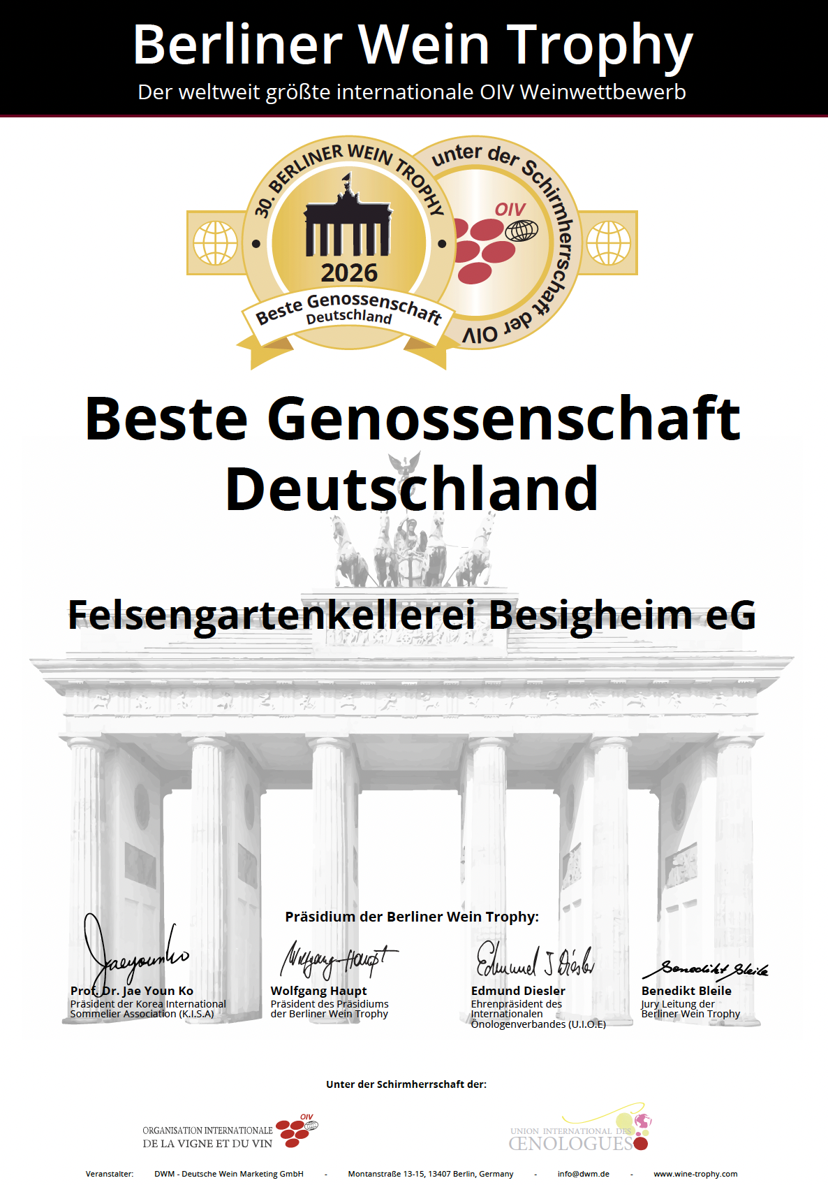 Beste Genossenschaft Deutschland Ausgezeichnet durch die Berliner Wein Trophy 2026